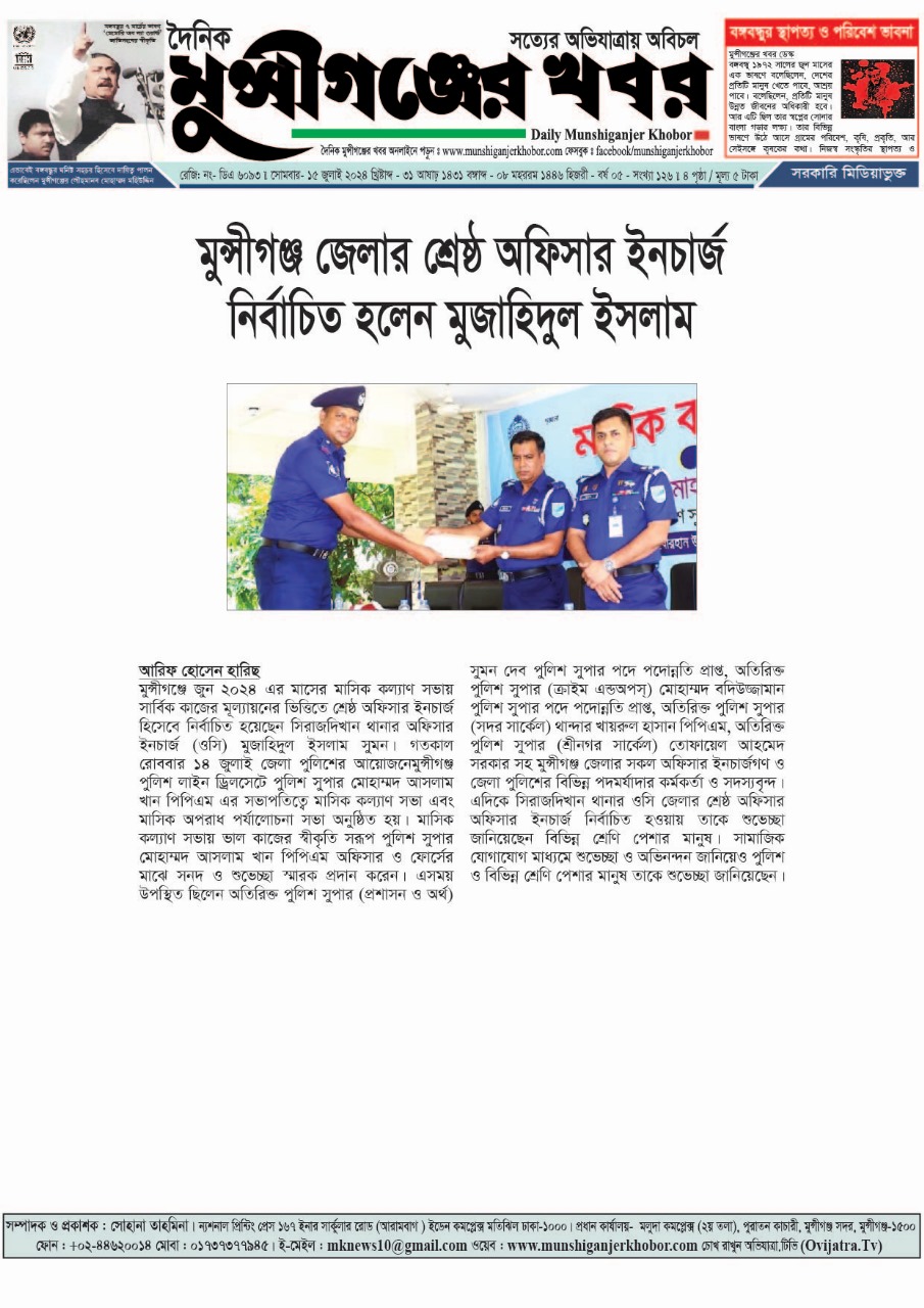 জ্বালানি সংকটে থমকে গেছে দিঘীরপাড়ের জীবন: কর্মহীন ৫০০ মোটরসাইকেলচালক, দুর্ভোগে জনজীবন সাত বছর পর ফিরল লাক্স সুপারস্টার: মুকুট জিতলেন রাজশাহীর বিদুষী বর্ণিতা গজারিয়াতে বীর মুক্তিযোদ্ধার ওপর হামলা: ১৭ জনের বিরুদ্ধে মামলা, একজন গ্রেপ্তার লৌহজংয়ে সংঘর্ষে নিহত ১, গ্রেপ্তার ১ মুন্সীগঞ্জে ৪ হাজার পিস ইয়াবাসহ এক ব্যক্তি গ্রেফতার গজারিয়ায় পরিযায়ী পাখি শিকার: অবসরপ্রাপ্ত সেনা কর্মকর্তাসহ ৬ জনকে জরিমানা  মুন্সীগঞ্জে ১৫ জুলাইযোদ্ধার গেজেট বাতিল, প্রজ্ঞাপন জারি সরকারের মুন্সিগঞ্জে অটিজম শিশুদের মাঝে ঈদ সামগ্রী বিতরণ জাতীয় সংসদকে যুক্তি ও সমাধানের কেন্দ্র করতে চান প্রধানমন্ত্রী তারেক রহমান রমজানে সৌদি উপহারের খেজুর: মুন্সিগঞ্জের ১৮০ কার্টুন কোথায়—সামাজিক মাধ্যমে আলোচনা জাতীয় দুর্যোগ প্রস্তুতি দিবসে মুন্সীগঞ্জে ভূমিকম্প ও অগ্নিকাণ্ড বিষয়ক মহড়া দায়িত্ব ছাড়ার পর নতুন করে অপপ্রচার—দুর্নীতির অভিযোগ অস্বীকার আসিফ নজরুলের শ্রীনগরে উদ্ধারকৃত অর্ধগলিত লাশের পরিচয় মিলেছে ঢাকা-মাওয়া এক্সপ্রেসওয়েতে মোটরসাইকেল দূর্ঘটনায় নিহত-১আহত-১ শ্রীনগরে সিসি ক্যামেরায় দেখা গেল সন্দেহভাজন ডাকাতদের সিরাজদীখানে সূর্যমুখী চাষে মুখ ফিরিয়ে নিচ্ছেন কৃষকরা সিরাজদীখানে ইয়াবাসহ তিনজন গ্রেপ্তার নিমতলা বাজার সংলগ্ন খালে ময়লা ফেলা বন্ধে প্রশাসনের কঠোর অবস্থান শ্রীনগরে সরকারি হাসপাতাল পরিদর্শনে এমপি শেখ মো. আব্দুল্লাহ মুন্সীগঞ্জে অটোরিকশা চালক হত্যা: ১৯ দিন পর মরদেহ উদ্ধার, পরিকল্পনাকারীসহ আটক ৪